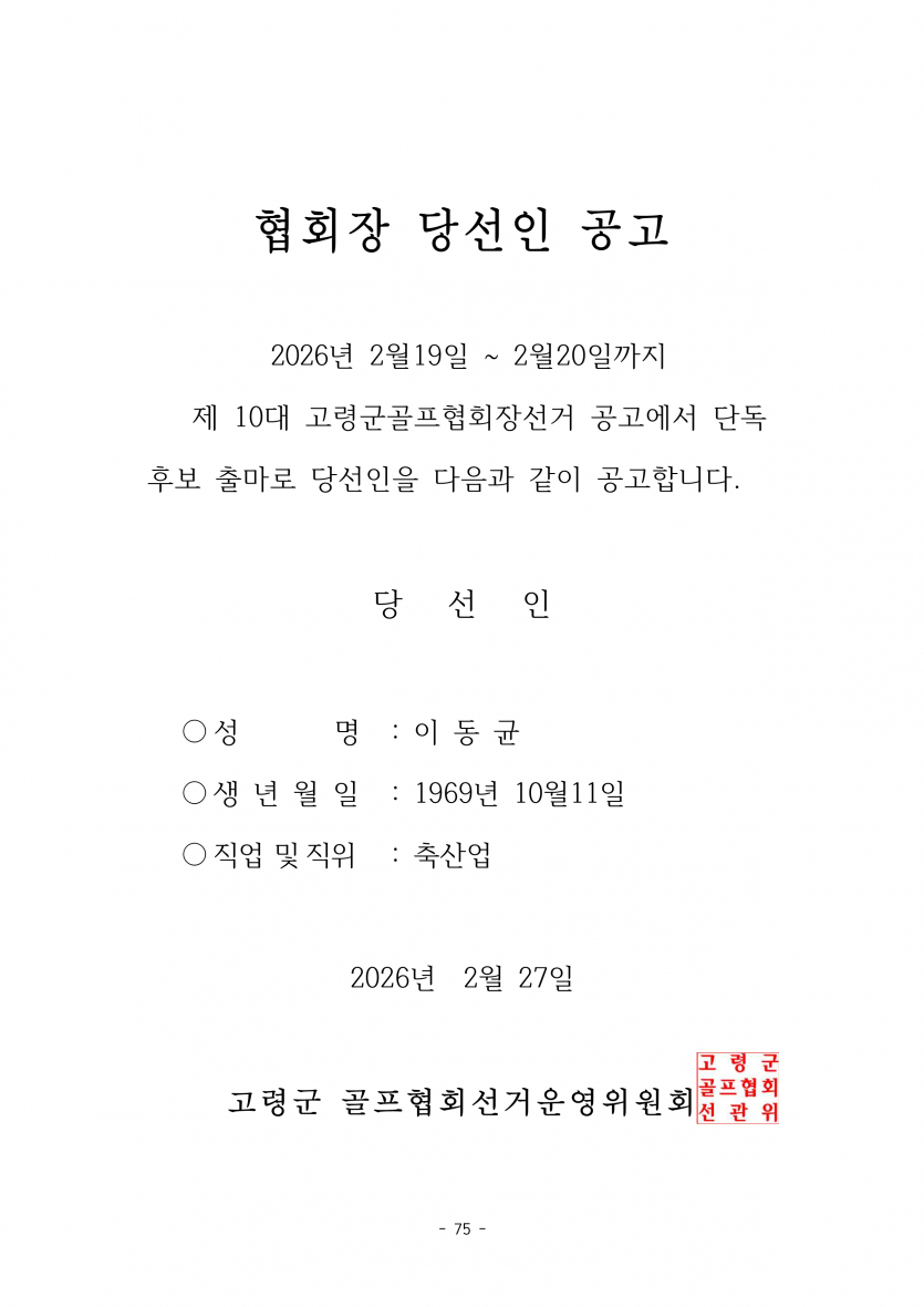 제10대 고령군 골프협회 회장 당선인 공고 페이지 정보 작성자 최고관리자 댓글 0건 조회 34회 작성일 26-02-27 12:21 . 목록 다음글 : 제10대 고령군 골프협회 회장 선거공고 26.02.14