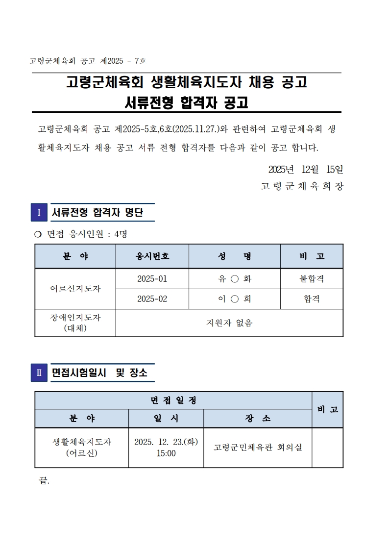 고령군체육회 생활체육지도자 채용공고 서류전형 합격자 공고 페이지 정보 작성자 최고관리자 댓글 0건 조회 3회 작성일 25-12-15 15:45 고령군체육회 생활체육지도자 채용공고 서류전형 합격자 공고 목록 다음글 : 어르신생활체육지도자 및 장애인생활체육지도자(대체) 채용공고 25.11.27